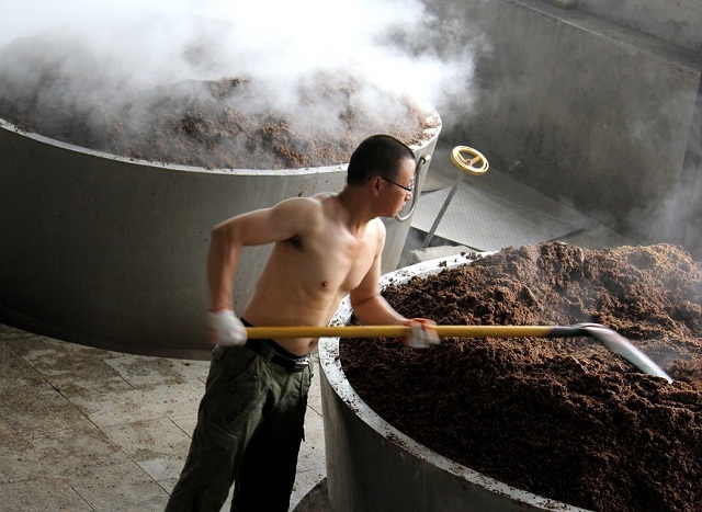 靠發(fā)酵產(chǎn)生的酒精度數(shù)其實(shí)很低,為了提高酒精度數(shù),一般還要進(jìn)行蒸餾提純,酒糟出池并均勻混入稻殼上甄,邊加料邊緩慢開啟蒸汽,滿甄后蓋上甄蓋,接通冷卻器,分段取酒。