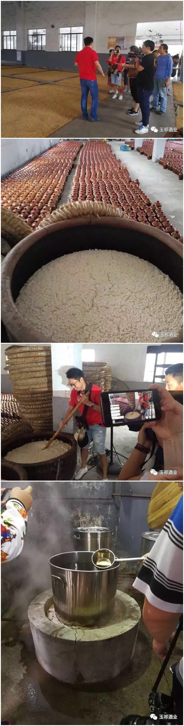 在工廠生產車間,大家直觀的看到了白酒的發(fā)酵和蒸餾工藝,也忍不住品嘗了純手工釀造的黃酒。一個個又大又深的發(fā)酵池、一縷縷正在流淌入桶內的原酒,無不訴說著玉祁酒廠傳統而精湛的釀酒技藝。