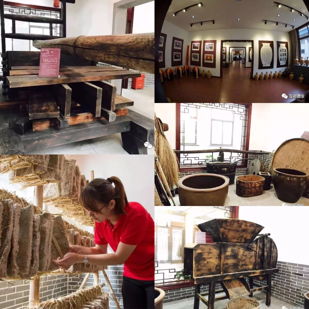 最后來到雙套酒技藝展覽館,這里有木蒸、濾漿架、濾漿桶、拌酵缸、裝曲小笆斗、制曲箱、壓榨墜石等一大批實物器具,結合兩邊墻上一張張的圖片資料,生動形象地將玉祁雙套釀酒的歷史、操作過程等原汁原味地呈現了出來。